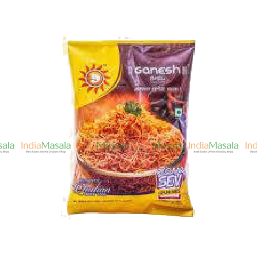 Ganesh Bhel Regular Sev is a crispy and tasty snack made from fried noodles made with gram flour besan These thin and crunchy noodles are seasoned with a blend of spices making them a delicious and addictive treat